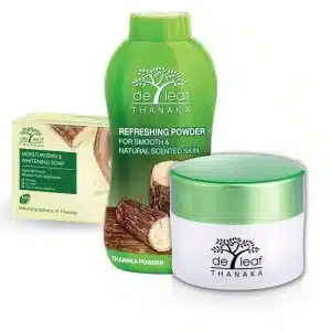 Important: The thanaka and ozone serum, and the depigmenting facial cream should only be used at night.